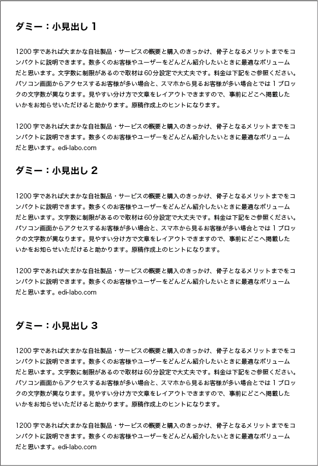 文字数1200字は画面上でどのくらいのボリュームで見えるか、サンプルページです(PC推奨)。 話題の柱を3つ入れ、詳しく説明できるボリュームです。 参考ページ ライティング基本料金 【初めての方へ】ライターにどうやって頼 … 続きを読む サンプルA/1200字テキストってどれくらい?