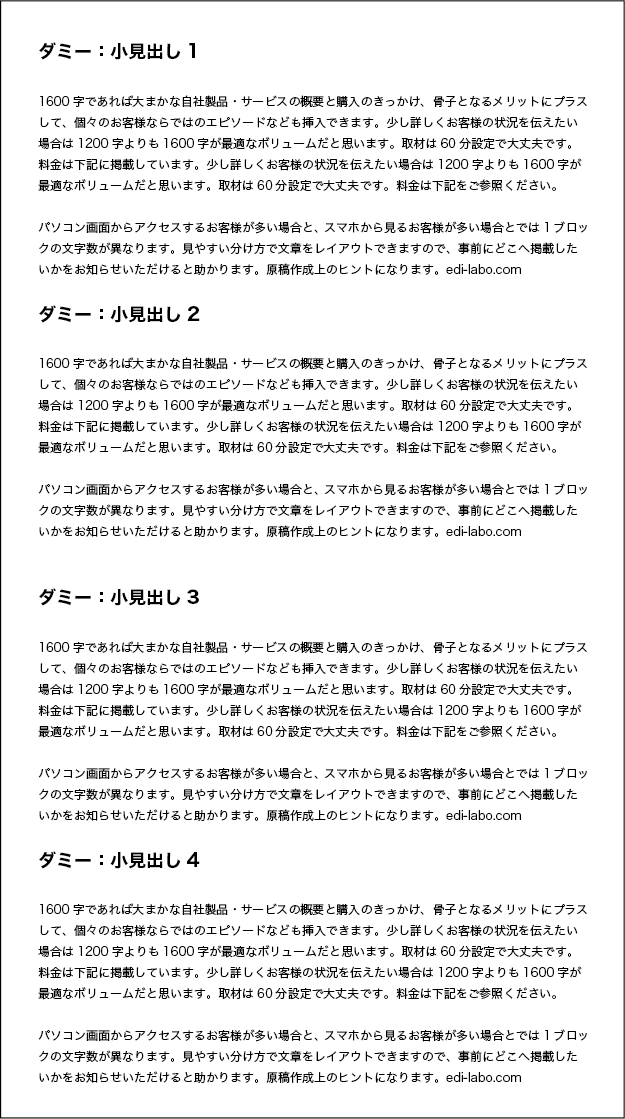 文字数1600字は画面上でどのくらいのボリュームで見えるか、サンプルページです(PC推奨)。 1200字と比較するとエピソードブロックをもう1つ加えることができ、4つの柱で説明できるボリュームです。 参考ページ ライティ … 続きを読む サンプルB/1600字テキストってどれくらい?